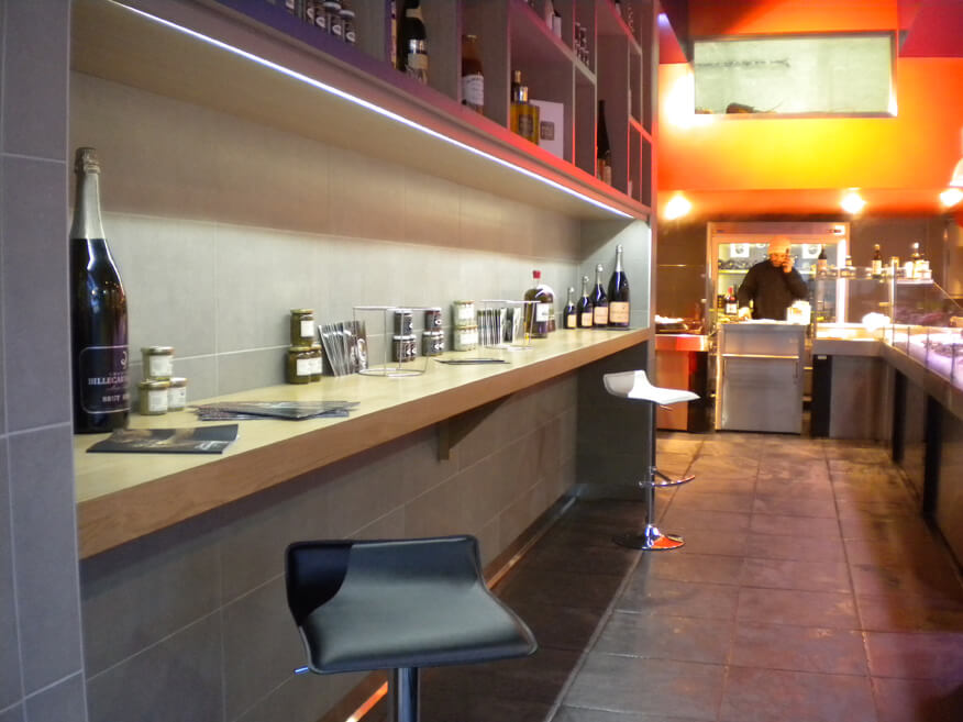 En Normandie, ce n’était pas dans les usages… C’est pourquoi, après celui de la poissonnerie, La Crustacerie à Deauville, c’est avec grand plaisir que nous saluons l’ouverture du bar à huîtres de la poissonnerie Au Grand Large à Caen. Musique d’ambiance, déco gris béton teinté d’orange vif… C’est le décor planté par Marc Auguet, capitaine de la nouvelle poissonnerie « Au Grand Large ». Ouvert depuis fin novembre, ce nouvel « antre de la mer » a la particularité de proposer la dégustation d’huîtres, sur place. Le concept est simple : un coin spécialement aménagé – face à l’étalage traditionnel de poissons – avec comptoir en bois, tabourets design… un cadre idyllique pour apprécier les huîtres tant convoitées en ces fêtes de fin d’année, avec un « verre de vin blanc ou du champagne ». Un espace qui « amène de la chaleur humaine » souligne Marc Auguet. « L’idée est que chacun déguste l’huître présente à l’étalage, autour d’une table » le tout sous l’oeil intrigué des homards, installés en hauteur, dans leur vivier orange électrique.